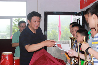 队员们还利用休息的时间在金寨县革命烈士纪念馆前组织起一场小型的文艺演出,在革命烈士纪念碑前合影,致敬革命先烈、继承和发扬优良的革命传统。公司党委副书记奚泰来赴金寨看望支教中的队员,并随队伍冒雨来到关庙乡海清希望小学。这里时有暴雨、山体滑坡、地震发生,校内搭有临时救灾帐篷,队员们临时在帐篷里给孩子们上起了音乐课,虽然身处这样的环境却丝毫不影响孩子们对音乐的喜爱和知识的渴求。奚书记将准备的礼物分发给这里的孩子,希望有音乐的陪伴的山区孩子们永远快乐。