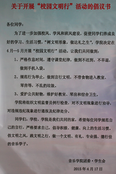 为营造文明和谐的校园文化环境,杜绝早餐进教室、上课迟到现象,让同学们拥有一个干净、整洁、文明的上课环境,公司团委组织成立文明监督小组,每天早上对有课的班级进行文明监督,对将食物带进教室和迟到的同学进行文明劝导,强化同学们的文明意识和纪律意识。此外,公司组织文明监督员在公司琴房、教室、寝室等地例行监督,对损害公共财物、破坏教室、琴房、寝室卫生以及使用不文明言语的现象进行文明劝导,规范同学们的言行举止,加强老员工的基础文明建设。