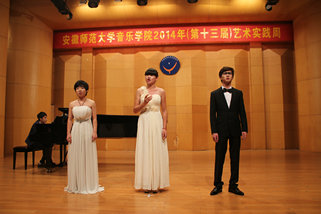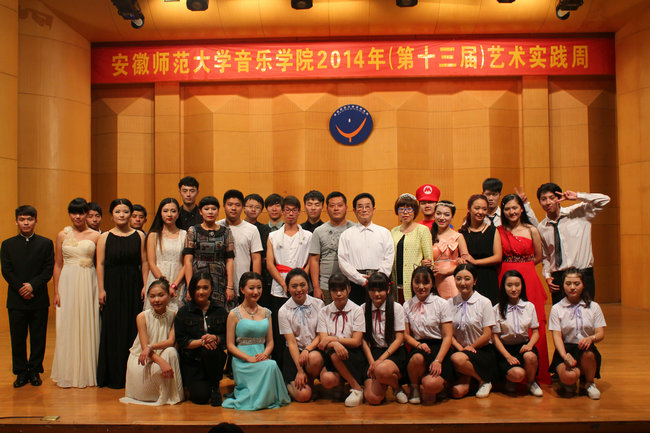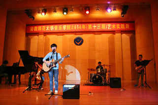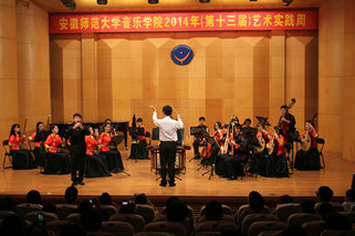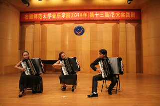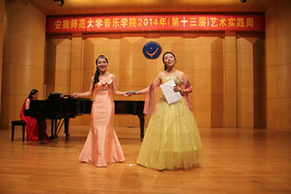 开场曲唢呐独奏《黄土情》由12级庄奎理同学带来,其质朴深情的曲调表达了西北人们对家乡的热爱依恋之情。民乐小乐队的伴奏让这首曲子的立体形象更加地丰满,迅速把观众带入到黄土地特有的情境中。女声二重唱《待到微风轻轻吹过》可谓是强强联手,由12级两位优秀的声乐主项同学演唱,曲调轻柔甜美,仿佛微风拂面令人沉醉其中。而女生三重唱《清风徐来》则是由蔡瑞等三名13级同学带来,在延续了前首轻灵优美的风格中加进了活泼俏皮的元素,也谕示着新老生之间的交替和成长。陶文斌等三位同学的手风琴三重奏《菊花台》将流行元素用古典乐器重新演绎,碰撞出激情的火花。刘雯君的古筝独奏《袖梦》手起手落出的丝丝情意,带观众体验了一个如梦似幻、行云流水般的世界。接着,一曲优美的歌伴舞《伴君常开花一朵》,满足了现场听众视觉与听觉的双重享受。上半场最后一个节目,是由12级的张蕾等四位同学演奏的器乐重奏《幽灵公主》。钢琴的纯净、古筝的韵味、小提琴的优雅和二胡的悲凉,看似不协调的组合在同学们娴熟的配合下演绎地淋漓尽致,洗净铅华最本质的音乐直抵听众内心,让全场听众为之感动。