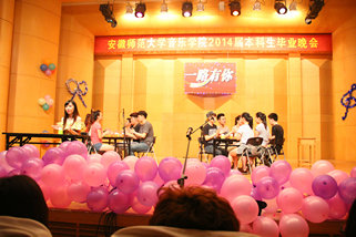 晚会在洋溢着青春气息的开场舞《美好的夜晚》中拉开帷幕,巧妙的舞台设计,动感的激情演出,立即引起全场的热烈欢呼。水鼓舞《中国龙》大气震撼,拉丁舞串烧《热情》数次掀起场内高潮。吉他伴唱,暖流阵阵;四年青春影像投射在舞台上,与现代舞《昨日重现》优美的舞姿结合,场面温馨动人。古典风的民乐合奏《雨醉江南》则带着所有观众再次品味着安徽师大、赭山镜湖。流行歌曲串烧、女声联唱、管乐合奏引发全场挥手合唱;《杯子歌》让观众随节拍律动;朗诵《难忘的青春》和音乐情景剧《老师去哪儿》则让观众在欢笑和泪水中重温着四年大学时光。