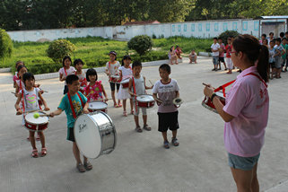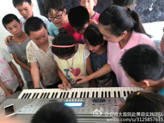 毛郢村地处偏僻的农村,贫穷的村庄、简陋的教室、崎岖的田路、不便利的交通及以信息闭塞的人民。志愿者们把背来的各种乐器放下时,小朋友们都围上来笑着问:“老师老师,这是什么?”手把手教授电子琴、竹笛、古筝……孩子们学的非常用心,老师们教的更加投入,山路崎岖、乐器太沉、蚊虫叮咬等困难全都抛在了脑后。教学结束时,天真可爱的孩子们给小老师们写了很多纸条,让志愿者们又开心又感动。
