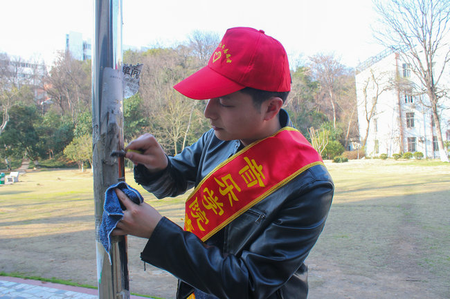 针对赭山校区遛狗现象,志愿者们开展了文明宣讲活动,对在校园内遛狗的市民进行面对面的文明劝导,希望他们到更适合的地方遛狗,牵住爱犬,以免咬伤路人,并及时清理干净宠物的排泄物,共同维护良好市容。志愿者们还在校园沿街路上清除校园“牛皮癣”,撕除电线杆及墙面上的垃圾广告,为展现美丽校园献力。
