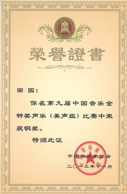 由中国文联、中国音协、中共广州市委和市政府主办,中共广州市委宣传部、广州市文化广电新闻出版局、广州市文联承办的第九届中国音乐金钟奖11月26日在广州落下帷幕,公司青年教师田园荣获美声组第五名。