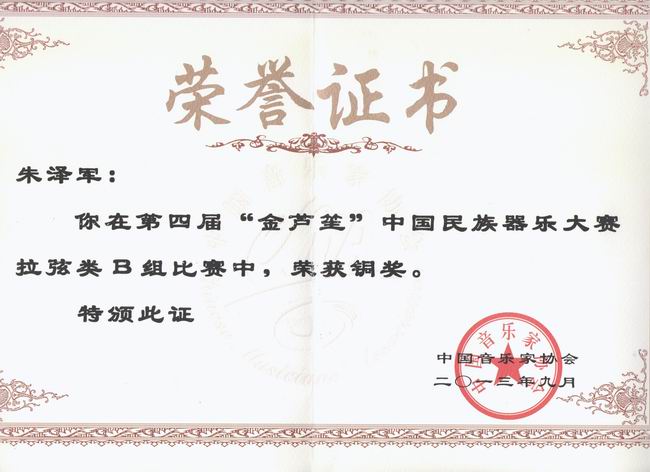 第四届“金芦笙”中国器乐大赛暨民族文化活动周由中国音乐家协会、贵州省文学艺术界联合会、中共黔东南州委、黔东南州人民政府主办,中国音协普通高校音乐联盟、贵州省音乐家协会、香港华夏音乐促进会、中共凯里市委、凯里市人民政府承办。此次大赛设弹拨类、吹管类、拉弦类3个大类共四个组,全国各地参赛选手近700人,参赛选手大多数为各高等院校音乐专业老师和员工以及各专业乐团的演奏家们,经过4个月的初赛录像选拔,有近220人入围复赛,在拉弦组的50位复赛选手中,朱泽军同学以一曲《离骚》突出重围进入决赛,在决赛22名选手中脱颖而出,以《二泉映月》、《炫动》打动评委最终获得拉弦类B组铜奖(二胡第五名),指导朱泽军的邱波老师获得优秀指导教师奖。