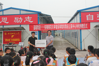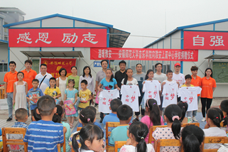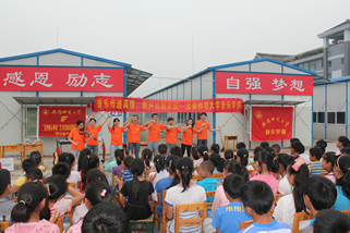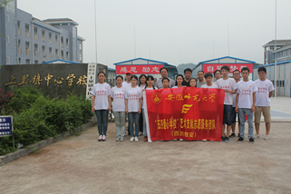 团队到达的时候,上里镇中心公司罗董事长、杨书记和几十个员工已经在校门口等待我们了,热情的接待给了团队成员莫大的鼓励。走进公司,最先映入眼帘的便是很多排整齐的板房和“感恩 立志 自强 梦想”八个大字。