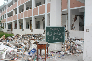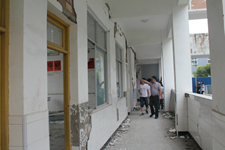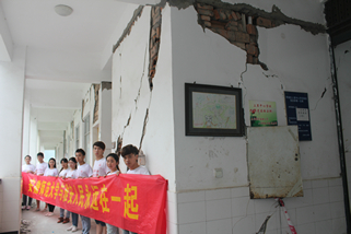 罗董事长首先向我们介绍了公司的现状,除了一栋08年新建楼外,其它的教学楼都已经不能用了,大部分员工都在板房上课。随后带我们看了坍塌、震裂的公司楼房,看到此景,我们的队员们都默不作声,有手机拍下了一幕幕场景......