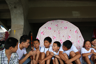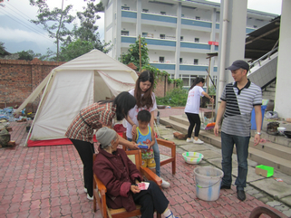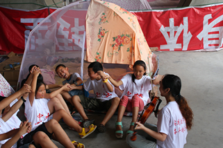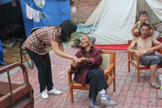 在芦山的灾民帐篷内,郭奶奶一家在享受午后片刻的宁静,郭大叔在哄6岁的孙子玩,年迈的郭奶奶身体不好,即使在夏天也要戴着厚厚的帽子。我们的到来让郭奶奶非常开心,她笑呵呵的和我们说,现在家里的日子还不错,有部分的劳动力还在地里干活,儿媳妇给他们留了饭,今天中午吃肉。简单的满足让志愿者们感触颇深,一直在打扫帐篷卫生的大一的志愿者杜静之离开的时候悄悄的对我说,“老师,郭奶奶家明明这么简陋,条件明明这么不好,可是她没有一点怨言,依然这样的开心和知足,觉得日子过的很好,我不知道怎么形容我现在的心理,就觉得心里酸酸的。”(TapTap点点 于珊珊)