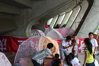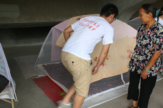 我们团队首先来到了雅安远郊的一个临时安置点。安置点是搭建在体育场的安全通道内的,一个个不大的蚊帐就是老人和孩子们可以暂时安身的家。帐篷不大,但东西还算齐备,在志愿者帮老奶奶收拾帐篷时,李奶奶感慨的对他们说,“政府给发的东西都是新的,被子什么的也都有,这样很好了,又凉快,感谢这么多好心人关心雅安,谢谢你们!”