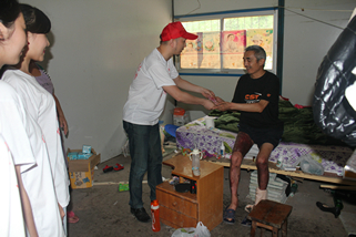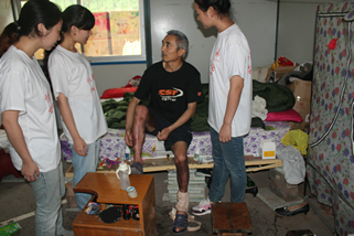 在上里的灾民安置点,我们认识了韩大爷,韩大爷的腿在灾难中受到重伤,尚未恢复的伤口让志愿者们感到切身般的疼痛,可能解决不了太多问题的慰问金是我们大家的心意。韩大爷的子女都在外地打工,聊起他们的时候,韩大爷脸上写满了笑容,“想,当然想喽,但是没有办法啊,让他们在外好好工作,不要担心家里。”志愿者小付听到韩大爷的话,感慨颇深,“父母的心态应该都是相同的,为了孩子可以牺牲自己的一切。实践这几天,爸每天几个电话问我做了什么,怎么样,告诉我注意安全,听老师的话。我现在特别想打个电话给他们,告诉他们——爸爸妈妈我爱你们!”