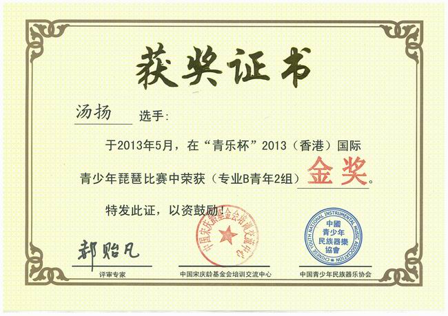 2013年5月28日至5月31日,国家部级单位中国宋庆龄基金会心灵彩虹计划之“青乐杯”2013(香港)国际青少年琵琶比赛总决赛在香港荃湾大会堂举行。公司2011级艺术硕士汤扬同学荣获专业B组青年2组(按年龄划分)金奖,为公司争得荣誉!