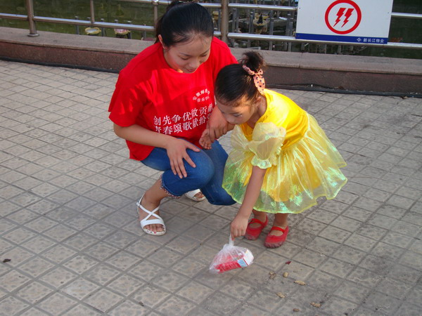 演出当天,实践团队成员向广大市民发放环保宣传单,普及环保知识,与周围的群众进行了互动,真诚地为他们讲解了有关各类环境污染的知识,并积极提倡人们从身边小事做起,重新拎起布袋子和篮子,减少塑料袋的使用量,减少环境污染;队员们不顾旅途劳累亲自带领当地小朋友一起捡垃圾,为垃圾分类,清理小广告,打扫附近卫生死角,用自己的双手装扮着能源城。