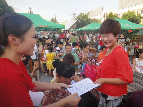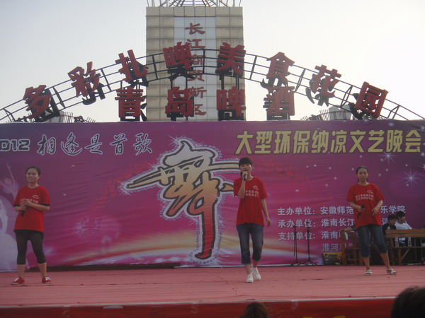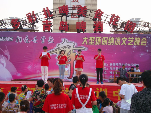 2012年7月11日-16日,TapTap点点实践团队一行16人,赴淮南开展环保宣传和义务支教活动,11日晚,淮南谢家集区长江商贸城露天舞台前人头攒动,一场以“加强环保意识,美化居住环境”为主题的环保纳凉晚会在这里举行,近300余人在现场观看了演出。