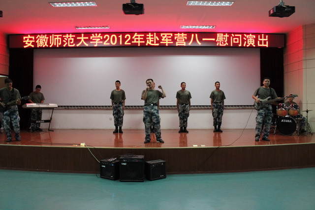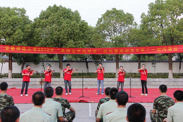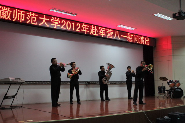 85年,征途漫漫,从无到有,从弱到强! 85年,励精图治,浴血奋战,赫赫劲旅!访军营、叙亲情、唱军歌,此次慰问演出可谓形式多样,内容丰富:唢呐、小提琴、排鼓、古筝、京胡等器乐演奏,不仅为广大官兵送上了视听盛宴,也营造着浓厚的节日氛围;独唱、四重唱、小合唱、独舞、群舞等,使节日的激情点燃全场;部队官兵们表演的军歌联唱、舞狮和快板等节目编排巧妙,动感的说唱十分精彩;而师大师生同台表演的钢管五重奏更是引爆全场,每场演出高潮迭起。