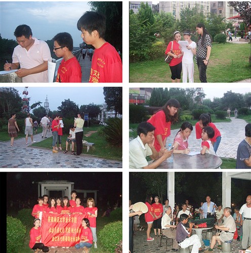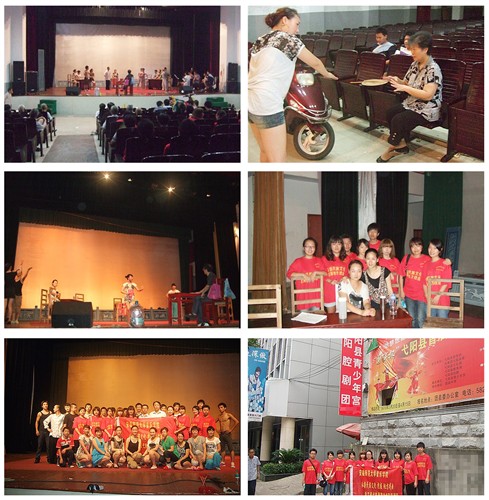 到达的当天,小组队员就来到了中国弋阳腔博物馆,博物馆工作人员们得知我们专程为弋阳腔而来,热情地给我们引路并详细地介绍了馆内现存的很多珍贵的弋阳腔资料,让队员们有幸看到许多珍贵的弋阳腔剧本、曲牌、服饰、脸谱、器械、乐器等资料,使队员们对弋阳腔有了初步的的了解。随后的两天,队员们前往滨江公园、社区文化中心等地,随机在散步、乘凉、唱戏的人群中开展关于弋阳腔的问卷调查;专程拜访一批弋阳腔退休老艺人,向他们请教学习,并现场拍摄采风了一批弋阳腔唱段,如《马前夫婿》等。7月18日,小分队来到弋阳县文化局,采访了“中国弋阳腔保护办公室”负责人黄主任。黄主任向我们介绍了弋阳腔目前的发展现状、以及成功申报中国民族民间文化保护工程试点项目以及首批国家级非物质文化遗产的过程。得知我们收集曲谱资料的迫切愿望,也为了鼓励更多的人更早地了解和传承弋阳腔,黄主任还赠送了我们一套尚未公开出版的弋阳腔画册及弋阳腔读本。画册里面全面记录了弋阳腔的剧照,脸谱,剧目和发展历史。读本里面记载了弋阳腔现今流传下来的全部唱腔选段和曲谱。7月19日,小分队又来到弋阳腔戏剧团,得到了剧团领导朱团长、叶书记的热情接待。在团领导的安排下,队员们有幸观看了著名的弋阳腔戏曲家杨典荣先生在台上带领剧团成员们排戏的过程,利用休息的时间,队员们与杨老师进行深入的交流学习,并现场向杨老师学唱了弋阳腔的经典唱段《玉簪记》。