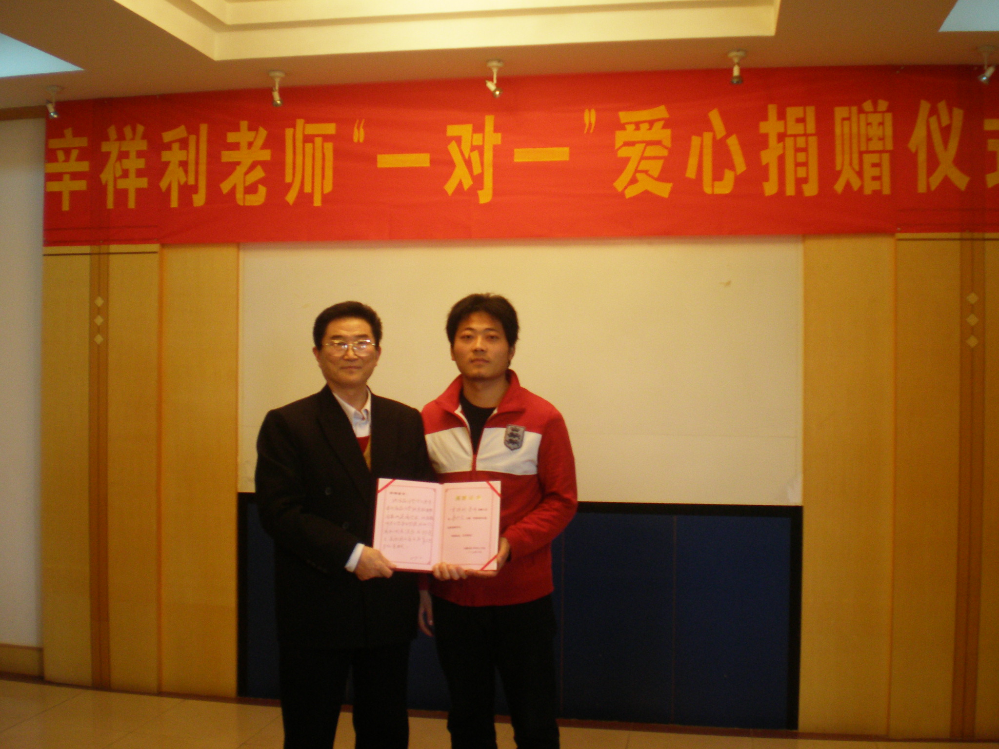 辛祥利老师在捐赠仪式上向受助同学张淼捐赠了一千元现金,并勉励他要克服困难,不断进步,早日成才;要继承和发扬TapTap点点的好传统,为国家音乐教育事业多做贡献。