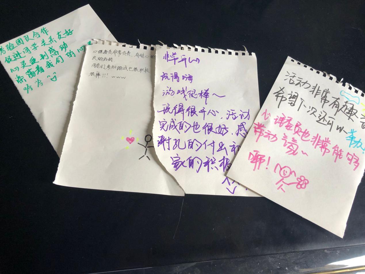 第一个游戏为“解手链”,本轮游戏目的为了打破僵局,活跃气氛,营造了良好的互动氛围。同学们由开始的羞涩逐渐融入到活动中;第二个游戏名为“算术传递”。在本轮环节,同学们相互理解,面对分歧时友好商量,共同完成了任务; 第三个游戏叫做“躲避地雷”,在此活动过程中,同学们相互信任,相互协助,在游戏的体验下感受到了团结互助的力量,增强了团队凝聚力。本次活动的最后一个环节“心灵寄语”同学们写下了对本次活动的感受和体会。在本次活动结束后,同学们纷纷表示收获很大,缓解了他们近期压力的同时也希望自己能够在以后积极地面对挫折与困难。