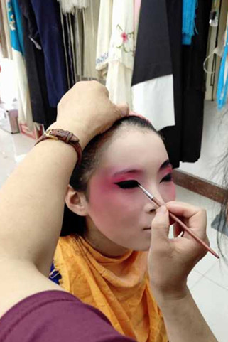 同学们在剧院学习期间恰逢演员们在排演新戏《三拂袖》,同学们在观众席上欣赏了演员们的演出之后都大为感叹。豫剧真不愧是唱腔铿锵大气、抑扬有度、韵味醇美的象征,一字一句之间都能感受得出戏曲敲击人心的声音,通过演员们的舞台表演,实践的队员们也深深的感受到了戏曲演员对于舞台的那一份热爱与尊重。金老师为同学们普及了在不同时间和场合之下,同一角色的演员的服装与妆容的差别,为了使同学们更好的感受戏曲文化,老师为其中一位同学上妆,从一开始的打底、腮红、眼影、眉毛、嘴唇,再到头饰,以及最后的服装,每一个方面无不体现着戏曲妆容的细腻与精致。