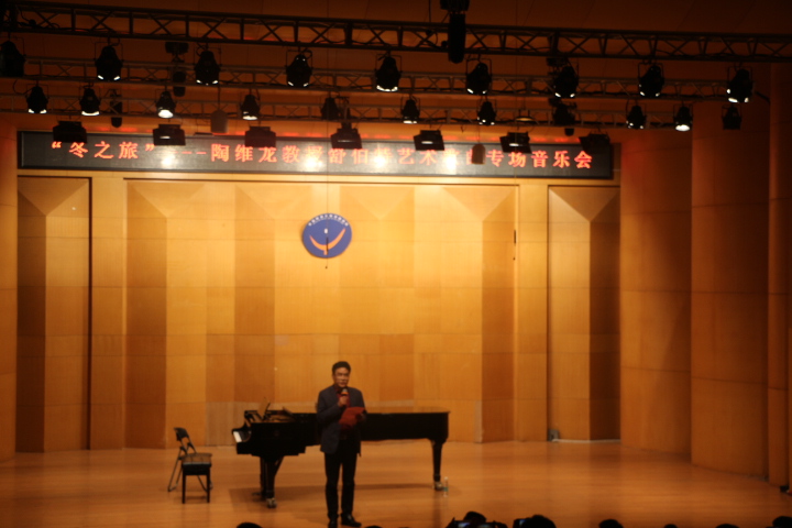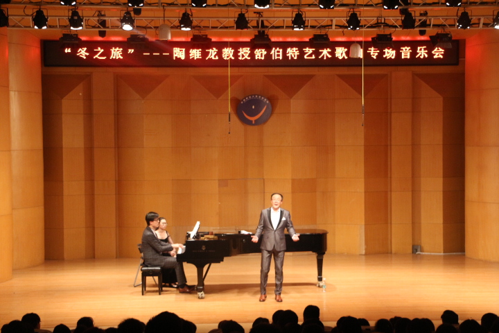 伴随着雷鸣般的掌声,陶维龙教授和艺术指导金麦克老师款款走向舞台中央,音乐会在美妙的钢琴声中拉开了序幕,本次音乐会所演唱的作品为舒伯特根据米勒诗词所创作的声乐套曲《冬之旅》,它与《美丽的磨坊女》、《天鹅之歌》共同称为舒伯特的三大歌曲集,音乐会演唱的《冬之旅》是一套由24首歌曲组成的套曲,彼此之间的内容以及调性紧密联系。陶维龙教授的演唱根据音乐作品的情感表达,时而闭眼,时而皱眉,时而摇头,时而快步走向前,时而又向后慢退,演唱过程自然流畅,情感表达饱满丰富,陶维龙教授收放自如的高音和微妙的低音,完美的诠释整套作品。整场音乐会持续一个半小时,演出期间陶维龙教授没有休息,没有喝一口水,直到落下最后一个音符时,全场爆发经久不息的掌声。