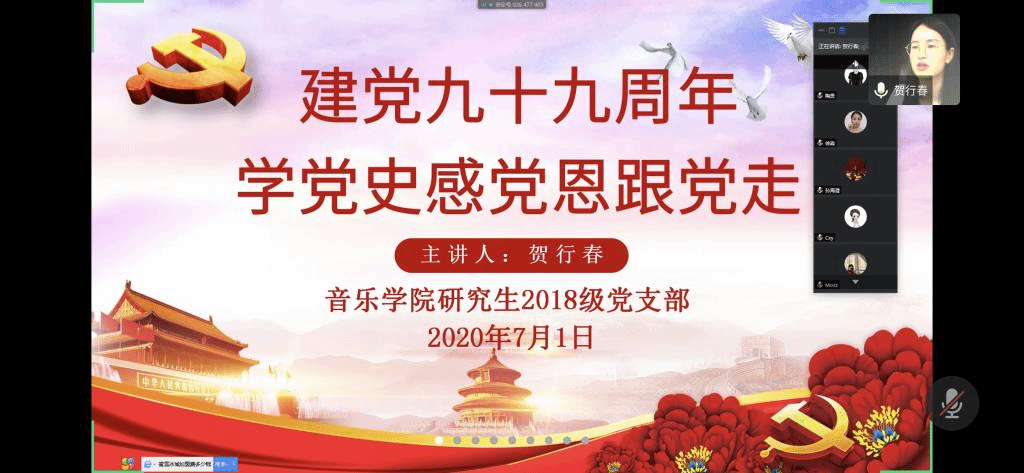 本网讯(研究生18级党支部 龚冰洁)九九如一,一心向党;初心如磐,使命在肩。为庆祝中国共产党成立九十九周年,7月1日上午9点,研究生2018级党支部通过腾讯会议线上开展“建党九十九周年——学党史感党恩跟党走”主题党日活动,活动由支部书记贺行春主持,研究生2018级全体党员参加。