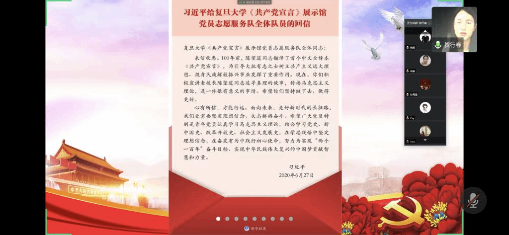 会议开始,支部书记贺行春带领大家学习了《习近平给复旦大学<共产党宣言>展示馆党员志愿服务队全体队员的回信》,回信中希望广大党员特别是青年党员认真学习马克思主义理论,结合学习党史、新中国史、改革开放史、社会主义发展史,在学思践悟中坚定理想信念,在奋发有为中践行初心使命,努力为实现“两个一百年”奋斗目标、实现中华民族伟大复兴的中国梦贡献智慧和力量。