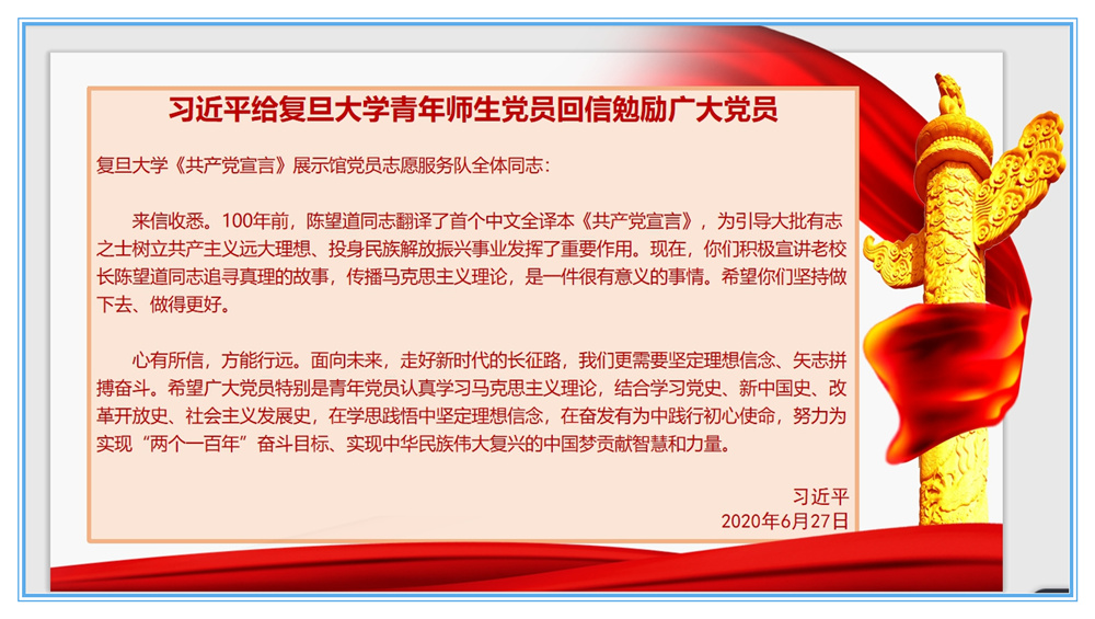 会议开始,党支部书记带领大家学习习近平给复旦大学《共产党宣言》展示馆党员志愿服务队全体队员的回信,并勉励同志们坚定理想信念、矢志拼搏奋斗,认真学习各项理论,在学思践悟中坚定理想信念,在奋发有为中践行初心使命,努力为实现“两个一百年”奋斗目标、实现中华民族伟大复兴的中国梦贡献智慧和力量。