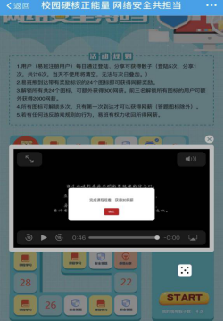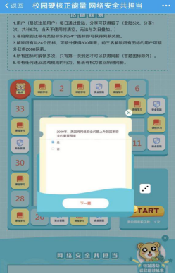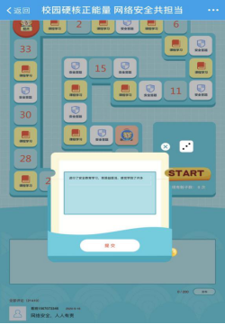 开展“校园硬核正能量 网络安全共担当”游戏活动。游戏中以“跳格子”的方式来完成任务并获得奖励,不同的步数会对应不同的安全问题,例如视频类、选择题等等。该游戏充满趣味性,让同学们在玩的同时学习到网络安全知识,可谓是“乐习并进”。