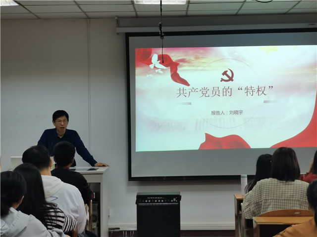 公司党委学工部部长、员工处处长刘晓宇老师应邀为公司学子作题为《共产党员的“特权”》的党课讲授。课中,刘晓宇从“特权”的含义、共产党员的“特权”内容、“特权”内容如何体现和如何行使党员“特权”等四个方面着眼,围绕党员行为规范的沿革与释义,用一个又一个生动鲜活的案例,向同学们一次又一次的阐释了共产党员的思想和行为要求。刘晓宇老师结合自身工作经历,语重心长的强调,全体入党积极分子要始终严格自我要求,员工干部更要带头做好表率。