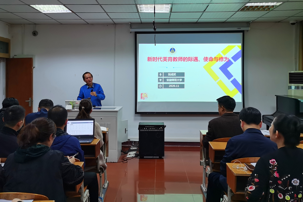 阮教授的报告会主要从三个方面展开:一是新时代为美育教师提供新际遇,二是新时代向美育教师赋予新使命,三是新时代对美育教师期待新修为。报告会从美育教育当前发展入题,阐释了党的十九届五中全会、全国教育大会特别是习近平总书记有关教育和美育的重要论述,论证了新时代背景下美育工作的重要性,重点谈了新时代美育教师的使命担当与作为。阮教授从“六个下功夫”谈到培养时代新人的重大使命,从“四有好老师”到“四个引路人”,再到“四个相统一”,落脚到“立德树人”的根本任务,强调教师队伍要以德立身、以德立学,以德施教,以德育德。