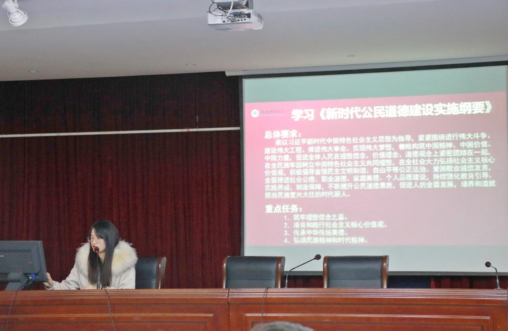 院十佳老员工和优秀志愿者选拔刚刚落下帷幕,辅导员首先恭喜我班获选员工,随后带领全体同学学习《新时代公民道德建设实施纲要》文件精神,以“筑牢理想信念之基、培育和践行社会主义核心价值观、传承中华传统美德、弘扬民族精神和时代精神”为重点任务。针对“社会主义核心价值观”以及“中华传统美德”的内容进行现场提问,同学们踊跃回答,现场气氛热烈。