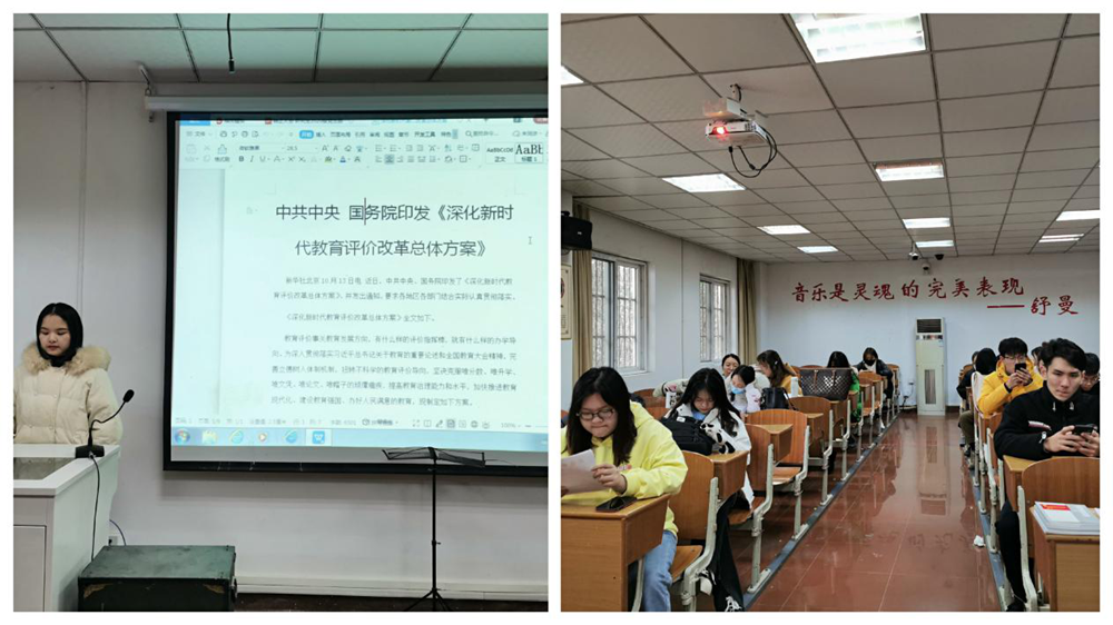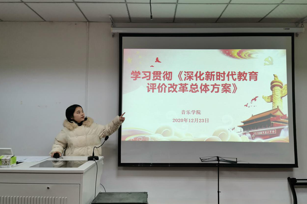 《深化新时代教育评价改革总体方案》是中华人民共和国第一个关于教育评价系统性改革的文件,其目的是要构建符合中国实际、具有世界水平的教育评价体系。会上,研究生2020级党支部书记章婷首先强调了《方案》出台的重要意义,并带领与会人员认真学习《方案》的具体内容。章婷强调全体党员需透彻理解《方案》内容,深刻领悟《方案》内涵,在今后的教学及学习中准确贯彻落实《方案》精神,为我国教育发展增动力、添活力。