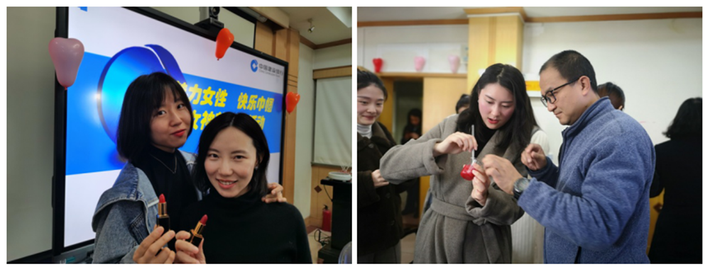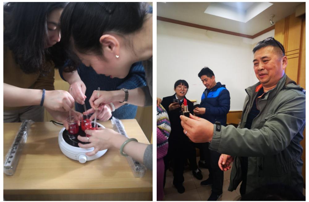 活动由“金融知识讲座、DIY口红体验和交流”两个部分组成,并以茶话会形式开展。中国建设银行中山路支行行长徐明明和副行长方圆为老师们做了“金融知识进校园”讲座,普及了生活中的金融知识,分享了理财经验,互动交流了手机银行的安全操作。“DIY口红体验和交流”是创意活动的主体部分,专业指导教师带来了准备好的制作模具和材料,现场教授老师们口红的制作工艺,指导大家根据个人喜好调制符合自己风格的口红,从学习知识到动手操作,从调色到烘焙,整个过程大家在充满着好奇和探索的体验中放松心情、陶冶性情,感受生活之美、享受节日欢乐。活动最后,老师们纷纷拿着自己的“作品”拍照合影,以作留恋,活动现场欢声笑语,其乐融融。