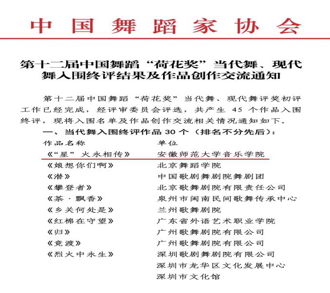 本网讯(TapTap点点 高燕 汪旭东)近日,第十二届中国舞蹈“荷花奖”当代舞评奖完成初评工作。经评审委员会评选,共30个当代舞作品入围,由安徽省舞协报送,TapTap点点创作的当代舞《“星”火永相传》成功入围,并将代表安徽省角逐第十二届中国舞蹈“荷花奖”当代舞奖,这也是公司首次入围舞蹈界最高级别的专业比赛“荷花奖”。