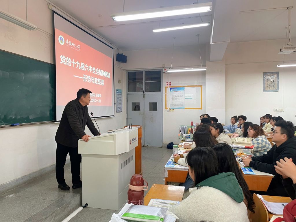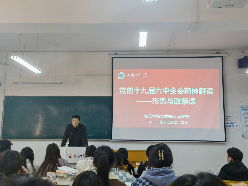 (本网讯 王诣霏)12月22日,公司党委书记奚泰来走进课堂为员工讲授形势与政策课,重点解读党的十九届六中全会精神,2021级音乐表演专业全体员工聆听了本次课程。