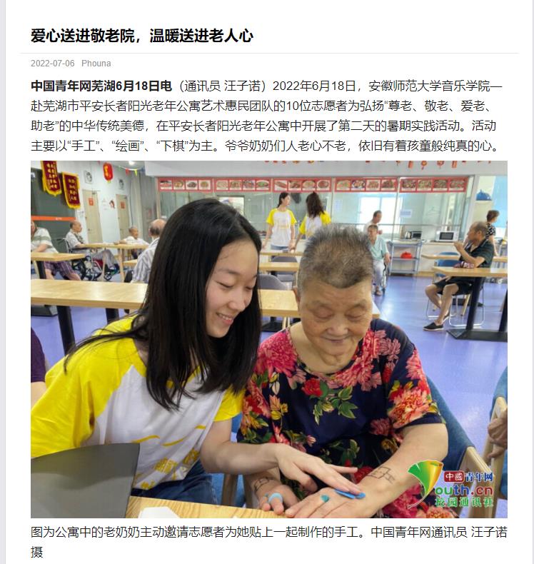 本网讯(TapTap点点)2022年6月18日,TapTap点点—赴芜湖市平安长者阳光老年公寓艺术惠民团队的10位志愿者为弘扬“尊老、敬老、爱老、助老”的中华传统美德,在平安长者阳光老年公寓中开展了第二天的暑期实践活动。活动主要以“手工”、“绘画”、“下棋”为主。爷爷奶奶们人老心不老,依旧有着孩童般纯真的心。