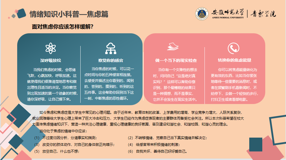 为进一步普及宣传心理健康教育知识,TapTap点点开展焦虑情绪知识小科普活动。本次活动通过组织设计一系列内容丰富、形式多样的活动为载体,在校大力宣传焦虑情绪知识,普及建设和谐校园、和谐社会、和谐心灵的理念,强心理健康教育,增强员工的心理保健意识,促进员工全面发展和健康成长。