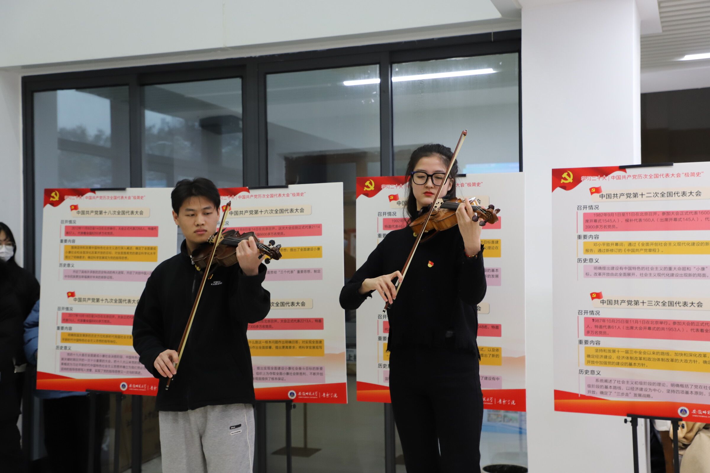 员工艺术团党支部结合专业,用艺术的形式回到那段烽烟四起、激情燃烧的岁月,重温党的历届党代会,缅怀历史,向先辈致敬。“宁可前进一步死,也决不后退半步生”“誓与大堤共存亡”“共产党员,跟我上”......单簧管、小提琴、琵琶、二胡、舞蹈在党员们演奏的美妙音乐中,历史的回响与现实的强音交相呼应,“不忘初心,继续前进,万水千山,最美中国道路。”在男女二重唱的深情演绎下,让共产党人的血脉贯通、精神延伸,在党和人民军队的奋斗征程中一以贯之,连接着过去、现在和未来。活动在《领航》的歌声中落下帷幕。