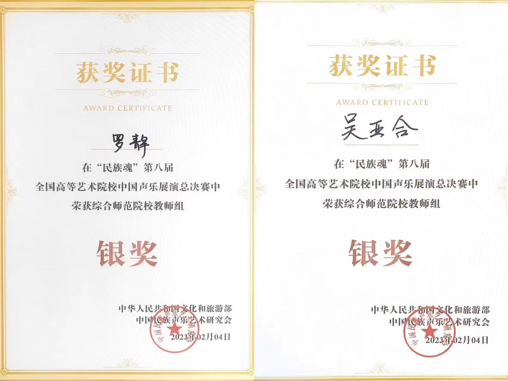 2月4日,由中华人民共和国文化和旅游部、中国民族声乐艺术研究会主办,由广州市文化艺术名家金铁霖、马秋华工作室、北京国韵艺术交流有限公司承办的民族魂·第八届全国高等艺术院校中国声乐展演暨第十届中国声乐论坛在广州圆满落幕。来自全国80余所高等艺术院校、综合类师范大学的优秀选手经过院校初赛、北京复赛的层层选拔,进入了“民族魂·第八届全国高等艺术院校中国声乐展演”的广州总决赛。公司选送的青年教师罗静、吴亚合经过激烈的角逐在总决赛中分别荣获综合师范院校教师组银奖。