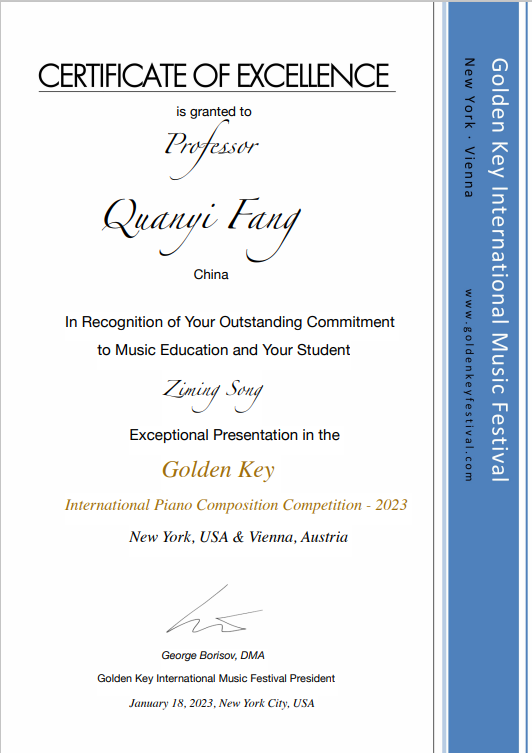 美国“金钥匙”国际作曲比赛 (GoldenKey Music Festival PianoCompositionCompetition)由金钥匙国际音乐节(2002年成立)主办,国际杰出的音乐家和音乐教授团队担任评委,旨在鼓励、发掘和培养新一代的作曲家及作曲爱好者展示创造力和表达力,此次大赛共有来自中国、法国、德国、新加坡、科威特、乌克兰、俄罗斯、波兰、日本、马来西亚、印尼、塞尔维亚、韩国、瑞士、黎巴嫩、土耳其、泰国、澳大利亚、英国、意大利等国家或地区的126名选手参加,竞争性强,关注度高,国际影响力大。