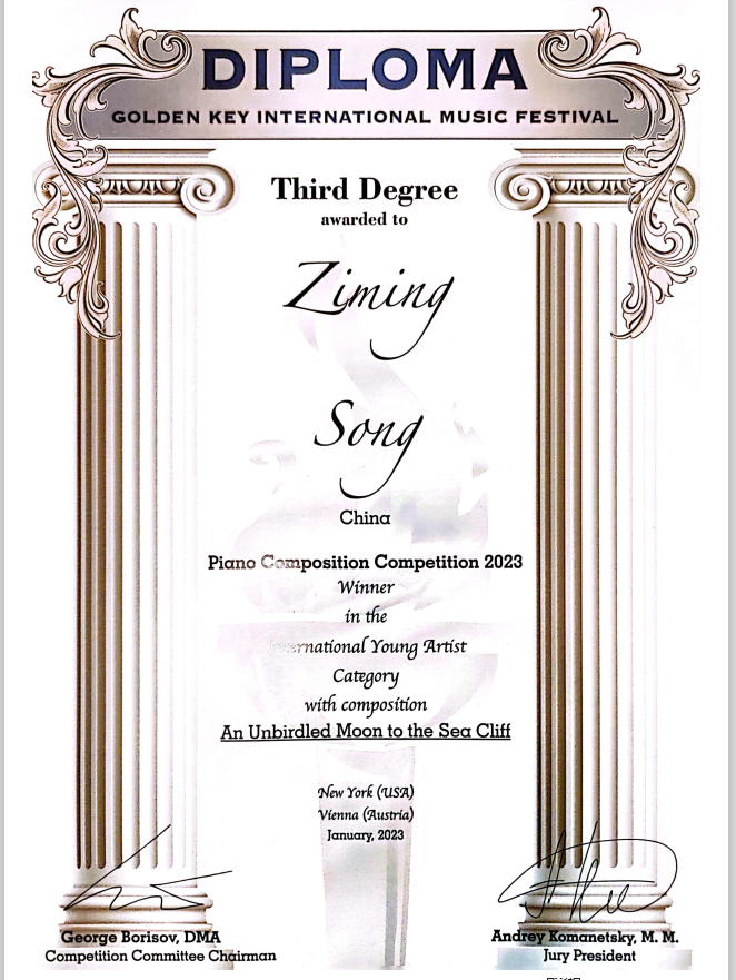 (本网讯 教学办)近日,2023 年度“金钥匙”国际作曲比赛结果公布,2019 级本科生宋梓铭创作的钢琴独奏《海崖肆月》荣获青年艺术家组三等奖,指导教师方权一被特别授予优秀指导教师奖。受“金钥匙”组委会官方邀请,宋梓铭将于今年 8 月前往奥地利参加“世界作曲家音乐会”(WorldComposers'Concert),在维也纳久负盛名的莫扎特故居——贝森朵夫音乐厅演奏自己的获奖作品。