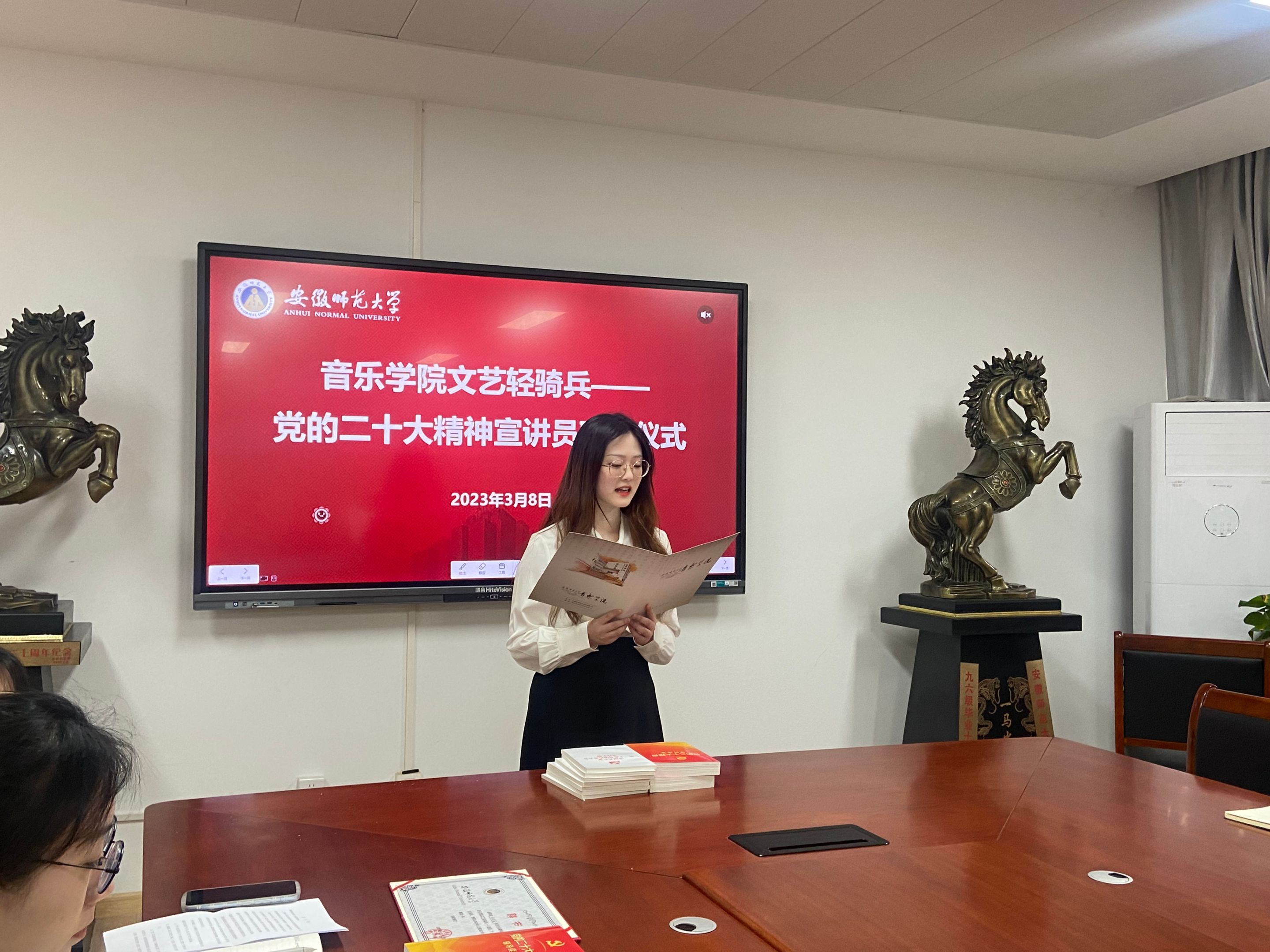 2021级音乐学专业汪芯蕊和2022级音乐学专业朱苏琳两位同学作为宣讲员代表发言,她们从所学所思所想等方面谈了学习党的二十大精神的学习体会,表达了作为党的二十大精神宣讲员感到责任重大、使命光荣,并对结合艺术专业特色开展宣讲作出规划。