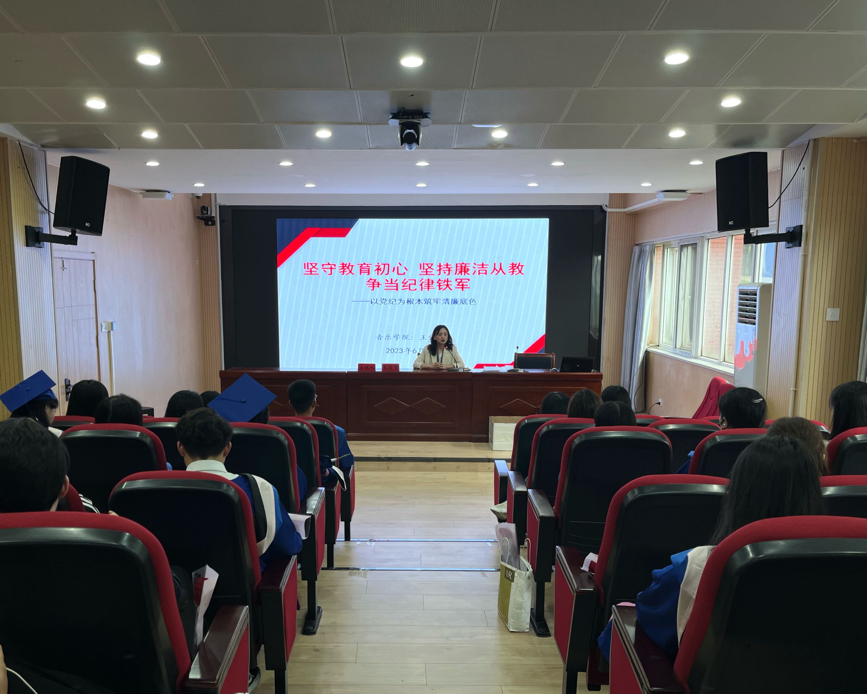 6月5日,公司党委副书记、纪委书记聚焦师德师风建设,讲授《坚守教育初心 坚持廉洁从教 争当纪律铁军——以党纪为根本强化师德师风建设》专题党课,教师代表、研究生毕业班全体同学参加,辅导员王诣霏主持。