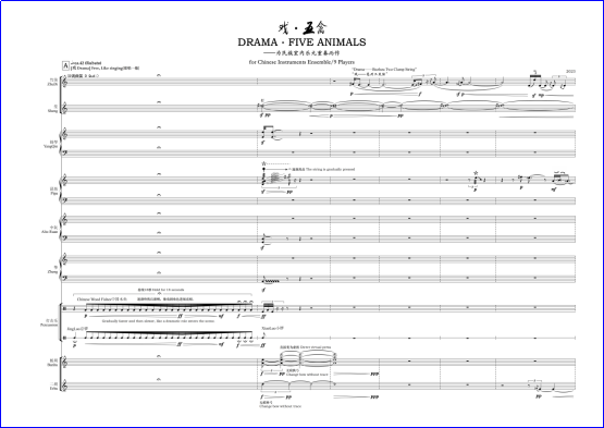 严杨林本次的获奖作品《戏·五禽》为九件民乐而作,内容来源于安徽亳州传统戏曲“二夹弦”以及安徽亳州东汉名医华佗所创编的养生功法“五禽戏”。作品将戏曲与五禽的不同神韵(虎之威猛、鹿之安舒、熊之沉稳、猿之灵巧、鸟之轻捷)进行结合,并根据五禽的不同个性选择五种自然意象与之对应(虎-雷,鹿-林,熊-山,猿-水,鸟-风)。