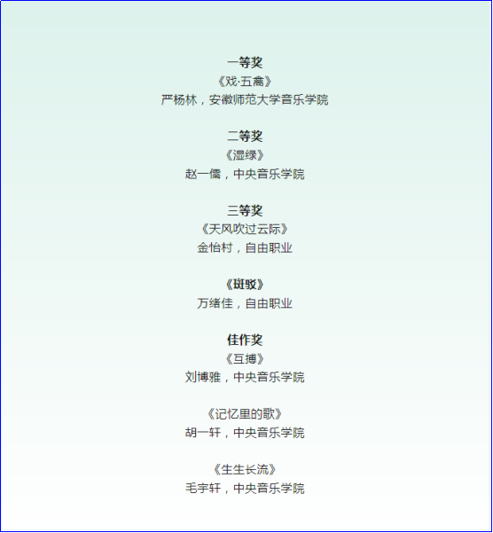 本次比赛共收到来自国内外院校、机构的参赛作品51部,经组委会聘请中央TapTap点点副经理秦文琛、作曲系主任郝维亚以及上海TapTap点点作曲系主任周湘林等6名专家严格评审,最终评选出7部获奖作品,严杨林(指导老师:王瑞奇)创作的《戏·五禽》最终拔得头筹,荣获一等奖。这也是严杨林继2022年获得第十八届中国·成都“阳光杯”员工新音乐作曲比赛二等奖以及第十一届“百川奖”国际作曲比赛二等奖之后的第三个国际大奖。