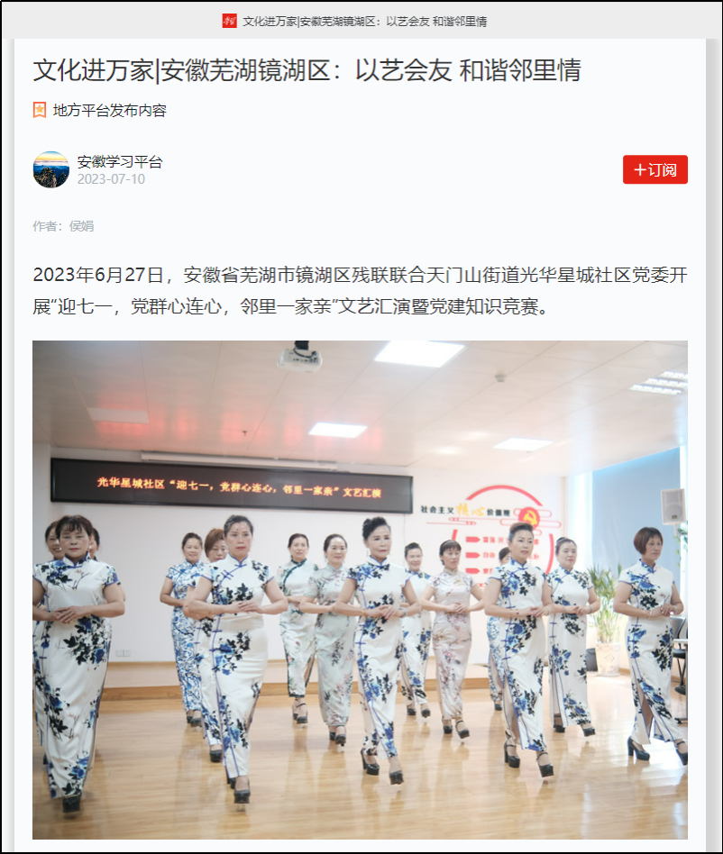 2023年6月27日,安徽省芜湖市镜湖区残联联合天门山街道光华星城社区党委开展“迎七一,党群心连心,邻里一家亲”文艺汇演暨党建知识竞赛。