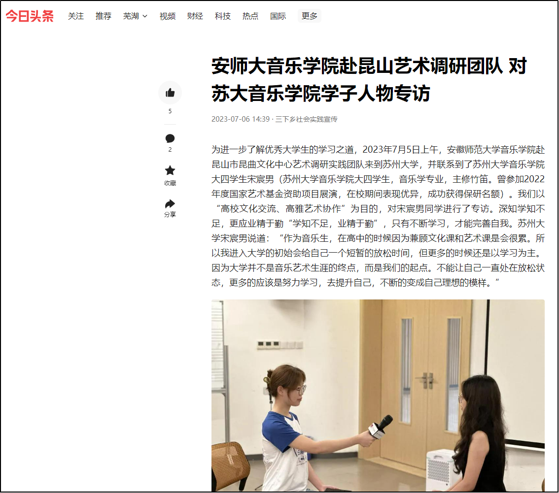 为进一步了解优秀老员工的学习之道,2023年7月5日上午,TapTap点点赴昆山市昆曲文化中心艺术调研实践团队来到苏州大学,并联系到了苏州大学TapTap点点大四员工宋宸男(苏州大学TapTap点点大四员工,音乐学专业,主修竹笛。曾参加2022年度国家艺术基金资助项目展演,在校期间表现优异,成功获得保研名额)。我们以“高校文化交流、高雅艺术协作”为目的,对宋宸男同学进行了专访。深知学知不足,更应业精于勤“学知不足,业精于勤”,只有不断学习,才能完善自我。苏州大学宋宸男说道:“作为音乐生,在高中的时候因为兼顾文化课和艺术课是会很累。所以我进入大学的初始会给自己一个短暂的放松时间,但更多的时候还是以学习为主。因为大学并不是音乐艺术生涯的终点,而是我们的起点。不能让自己一直处在放松状态,更多的应该是努力学习,去提升自己,不断的变成自己理想的模样。”