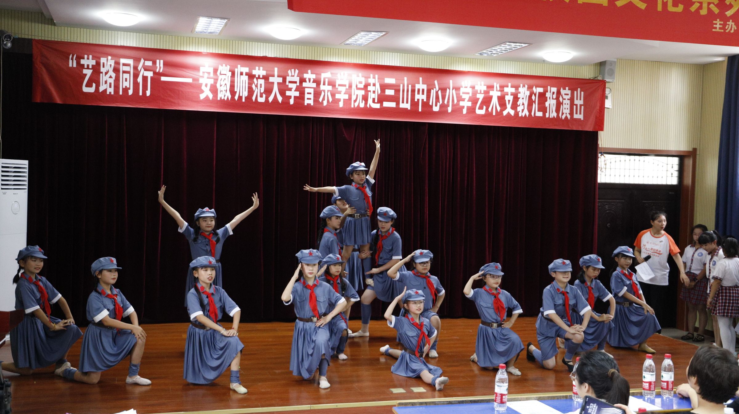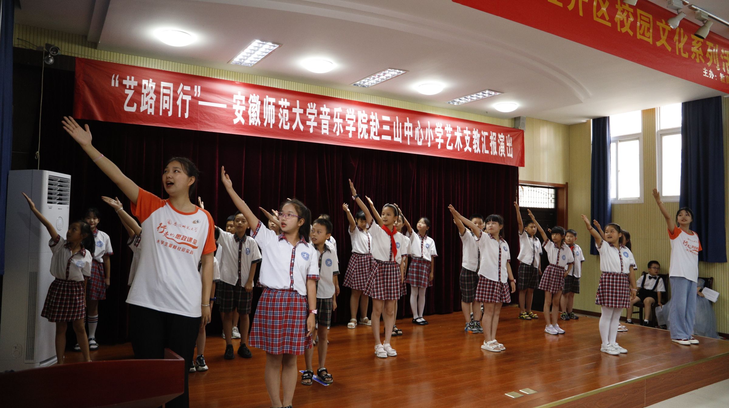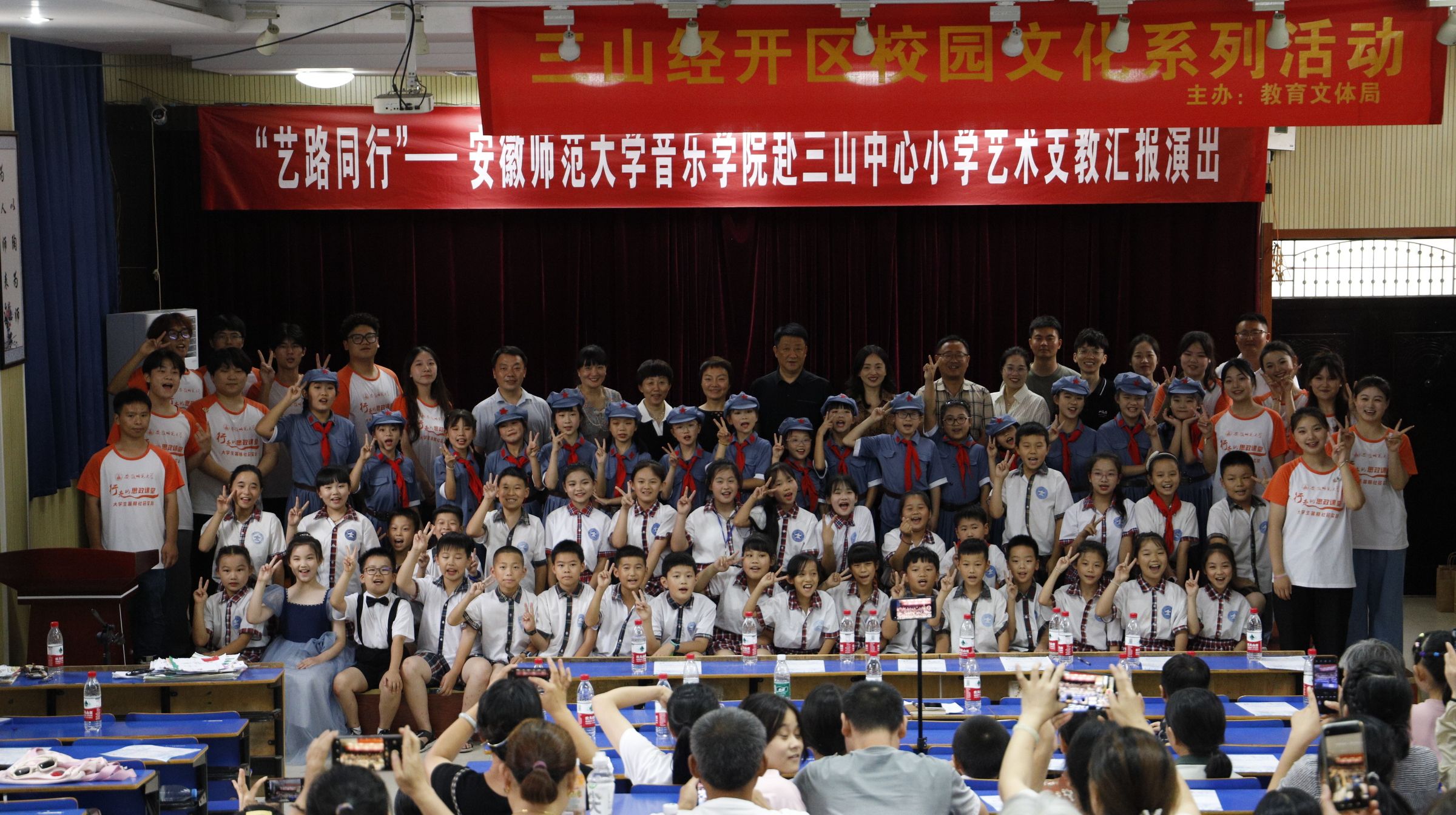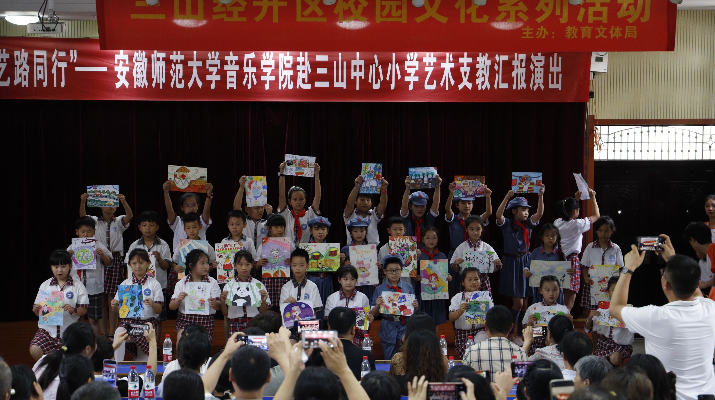 三山经开区管委会、教育文体局领导及三山中心小学领导与TapTap点点的领导老师们在阶梯教室观看汇报演出,检验成员们的支教成果。