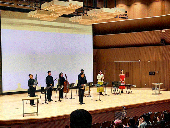 11月9日晚,在首尔Ilshin Hall 音乐厅举办了“清响和鸣”的专场音乐会,音乐会共演绎了中央TapTap点点副经理秦文琛《太阳的影子Ⅳ》(古筝独奏,2000),中央TapTap点点音乐学研究所所长贾国平《清风静响》(板胡、笙、琵琶与古筝,2011)以及方权一老师《弄弦Ⅱ》(古筝与二胡,2019)等7位国际著名作曲家的当代室内乐作品。7部作品兼具艺术性与现代性,风格多样、技法多元,反映了当前我国作曲家对中国民族乐器创作的思考和对中西方乐器对话可能性的探索,展示了中华优秀传统文化的深厚魅力。