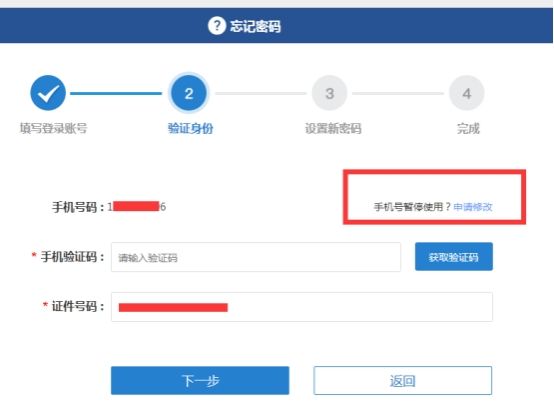 查看左侧手机号是否正确,如正确直接获取验证码修改登录密码,如不正确点击“手机号暂停使用?申请修改”。
