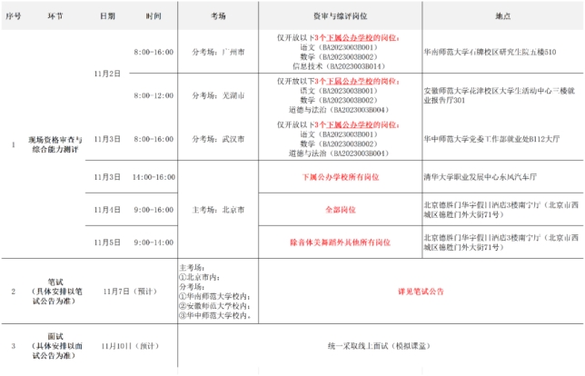 为做好本次招聘工作,我局设置了一个主考场和三个分考场,其中北京市为主考场,广州市、武汉市、芜湖市为分考场。具体招聘工作安排如下: