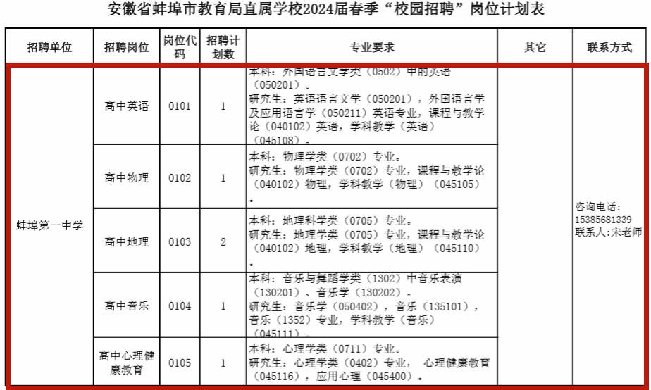 蚌埠第一中学计划招聘在编教师6名(蚌埠市教育局直属公司共招聘23名),具体岗位见附件1《安徽省蚌埠市教育局直属公司2024届春季“校园招聘”岗位计划表》(以下简称《岗位计划表》)。